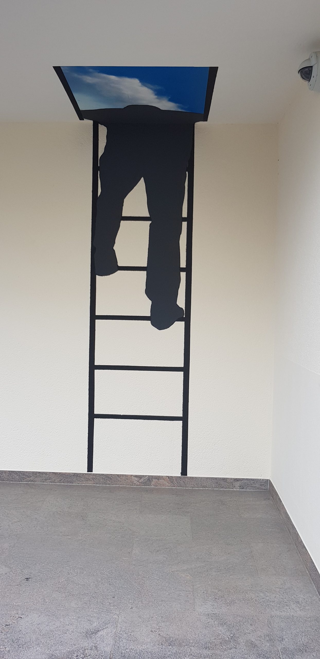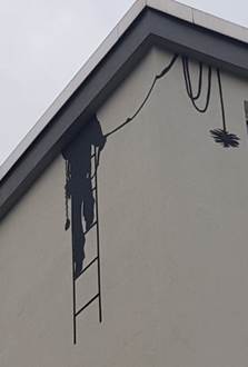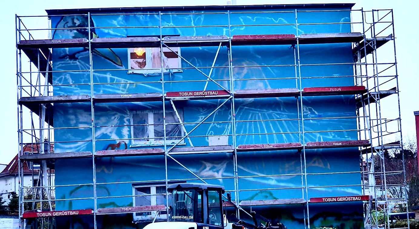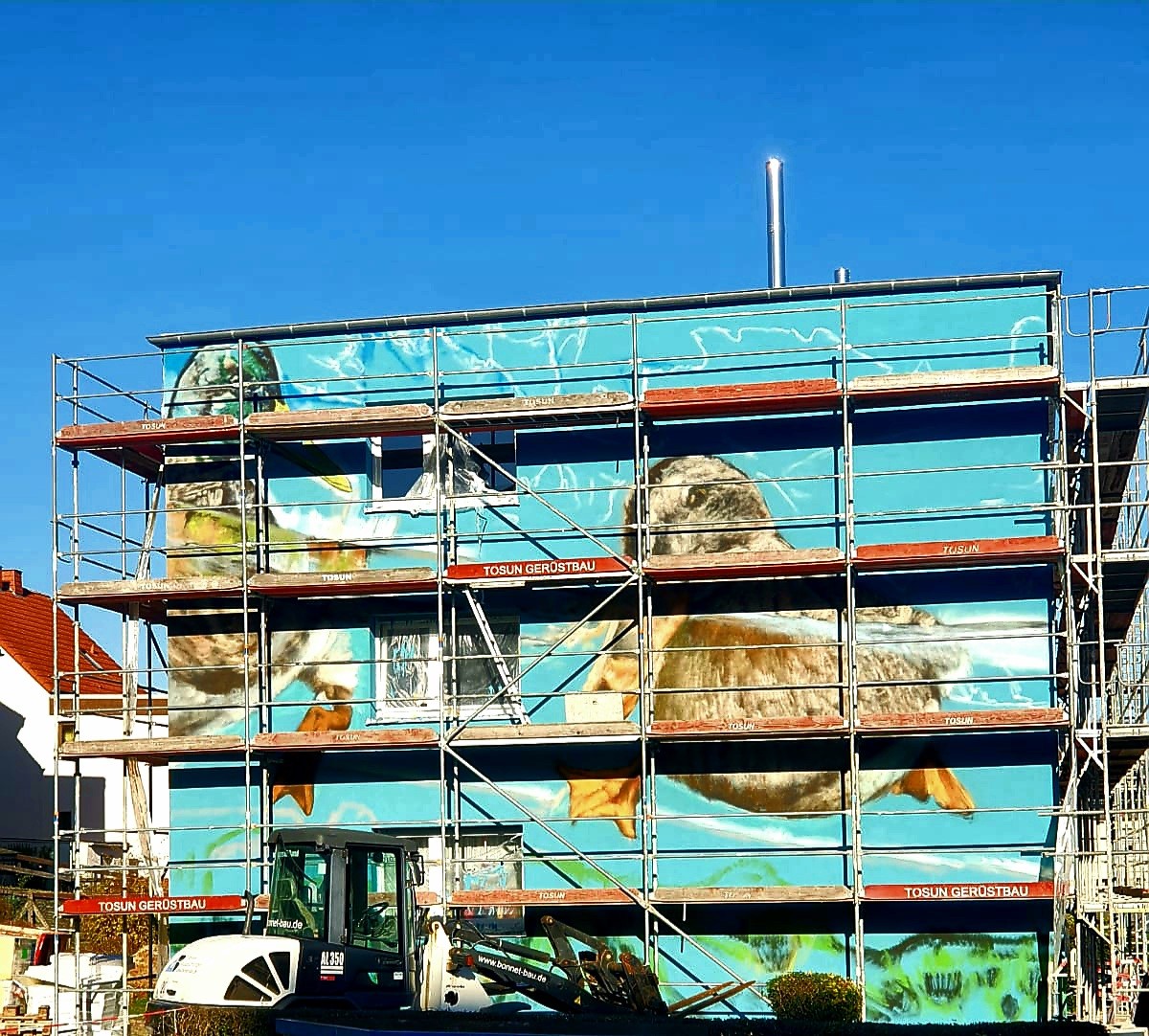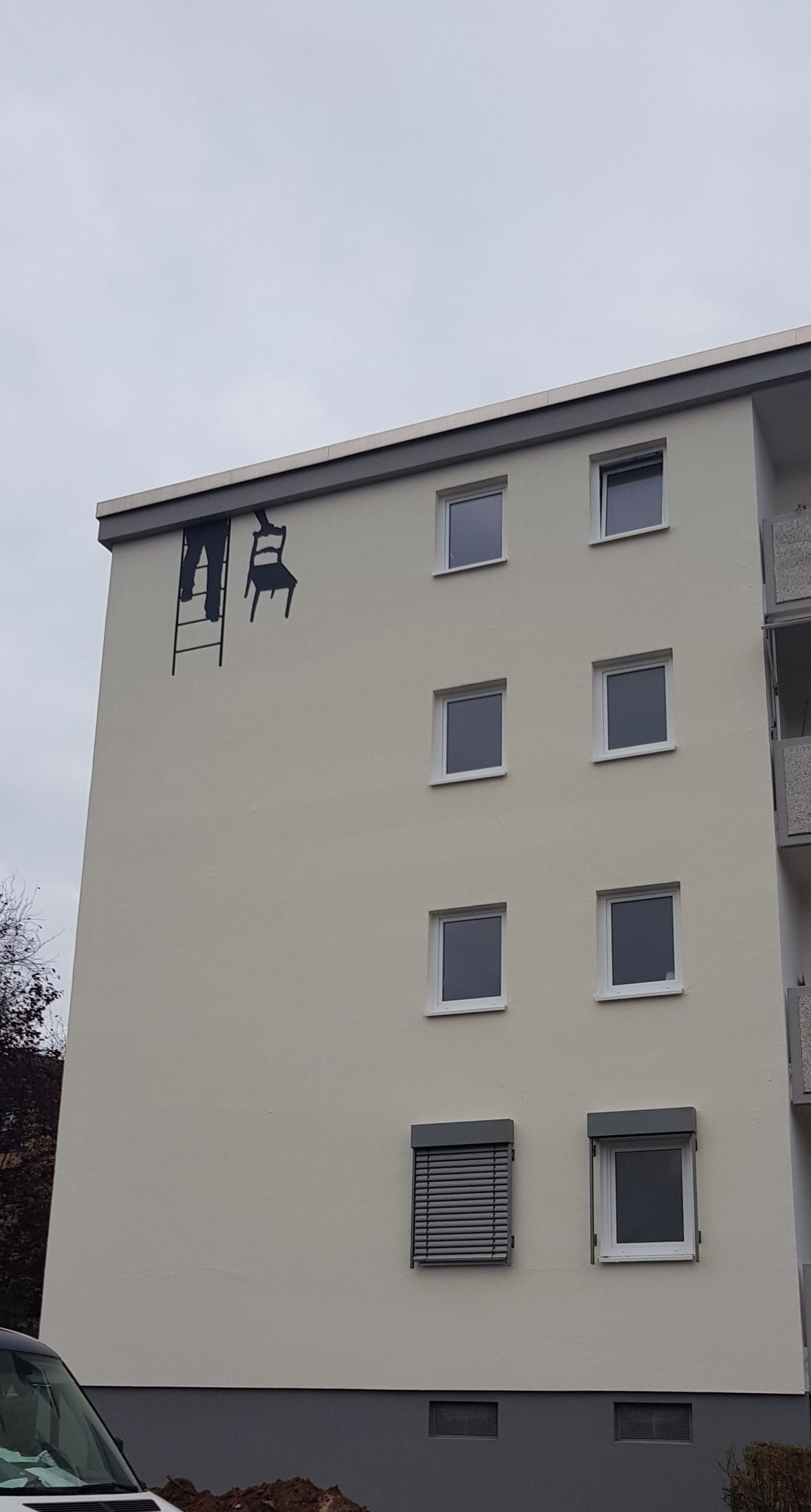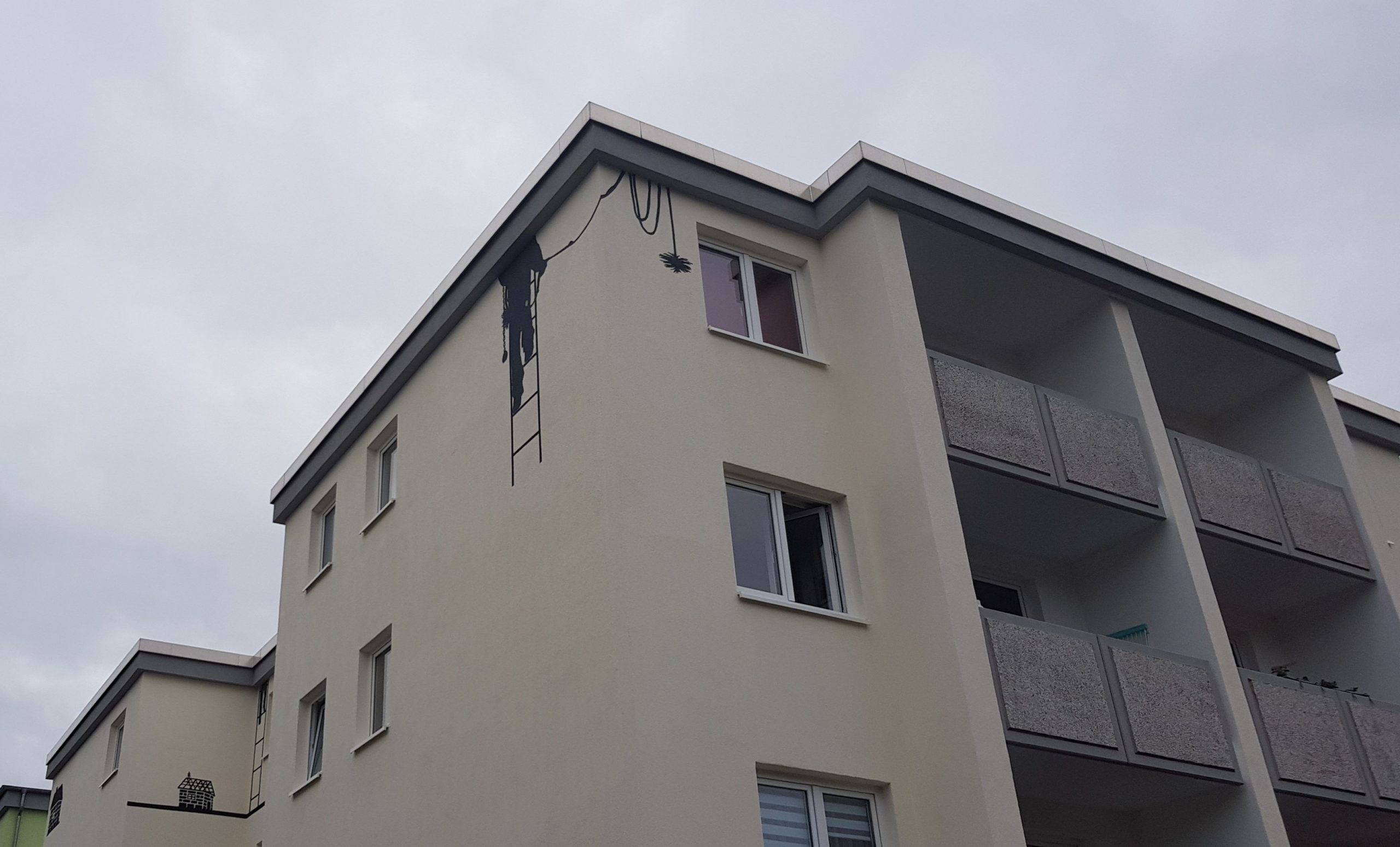 Da das Haus bereits über eine entsprechende Wärmedämmung verfügte, war nur noch ein neuer ansprechender Fassadenanstrich notwendig. In Zusammenarbeit mit einem lokalen Künstler entstand eine unverwechselbare Fassade mit Wiedererkennungswert.