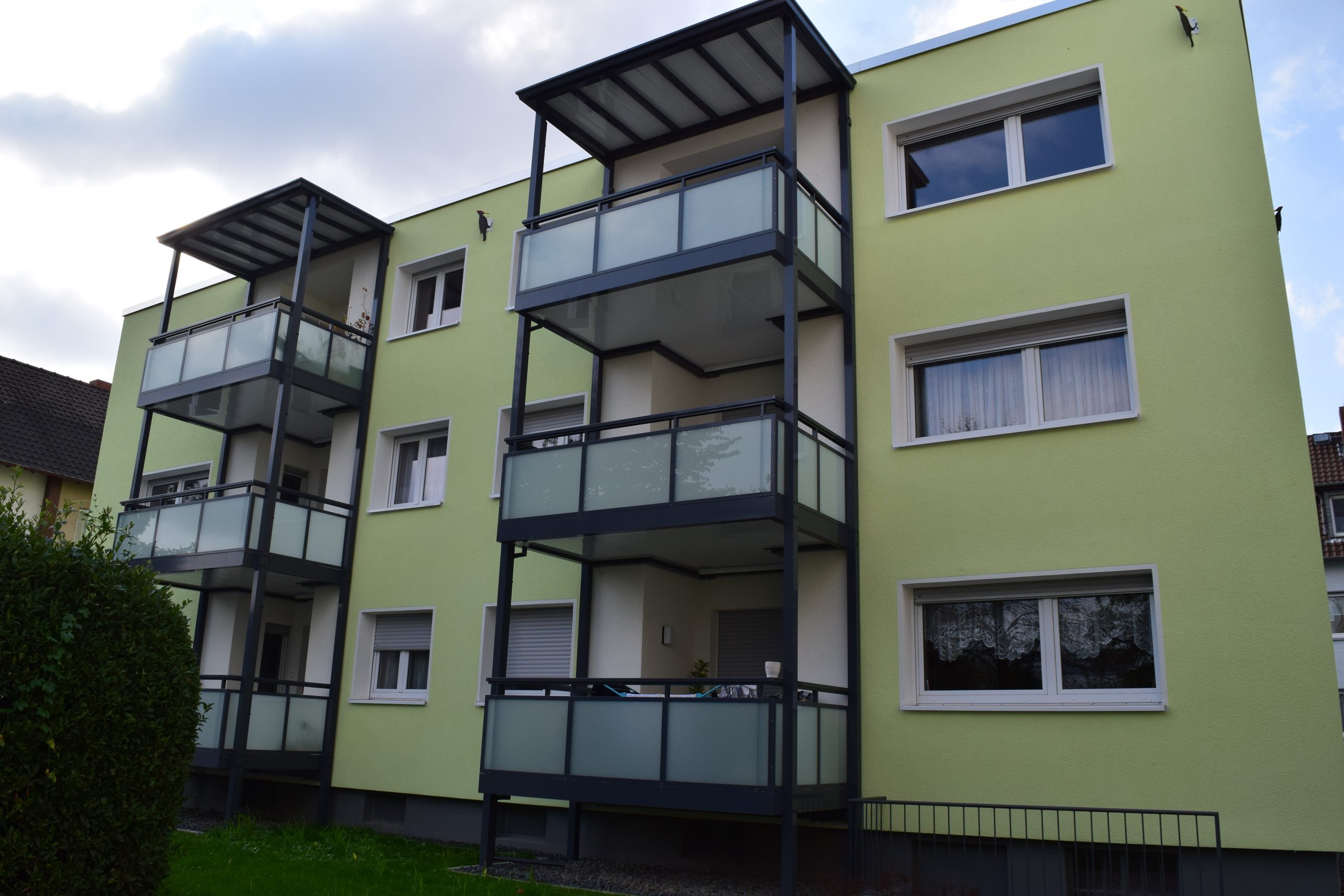 Die neuen Fertigbalkone sind aufgestellt. Der Parkplatz ist vergrößert und durch zwei Abstellplätze erweitert worden. Ein Zaun aus Doppelstabmatten ersetzt die Hecke hinter dem Haus. Die Modernisierung ist abgeschlossen.