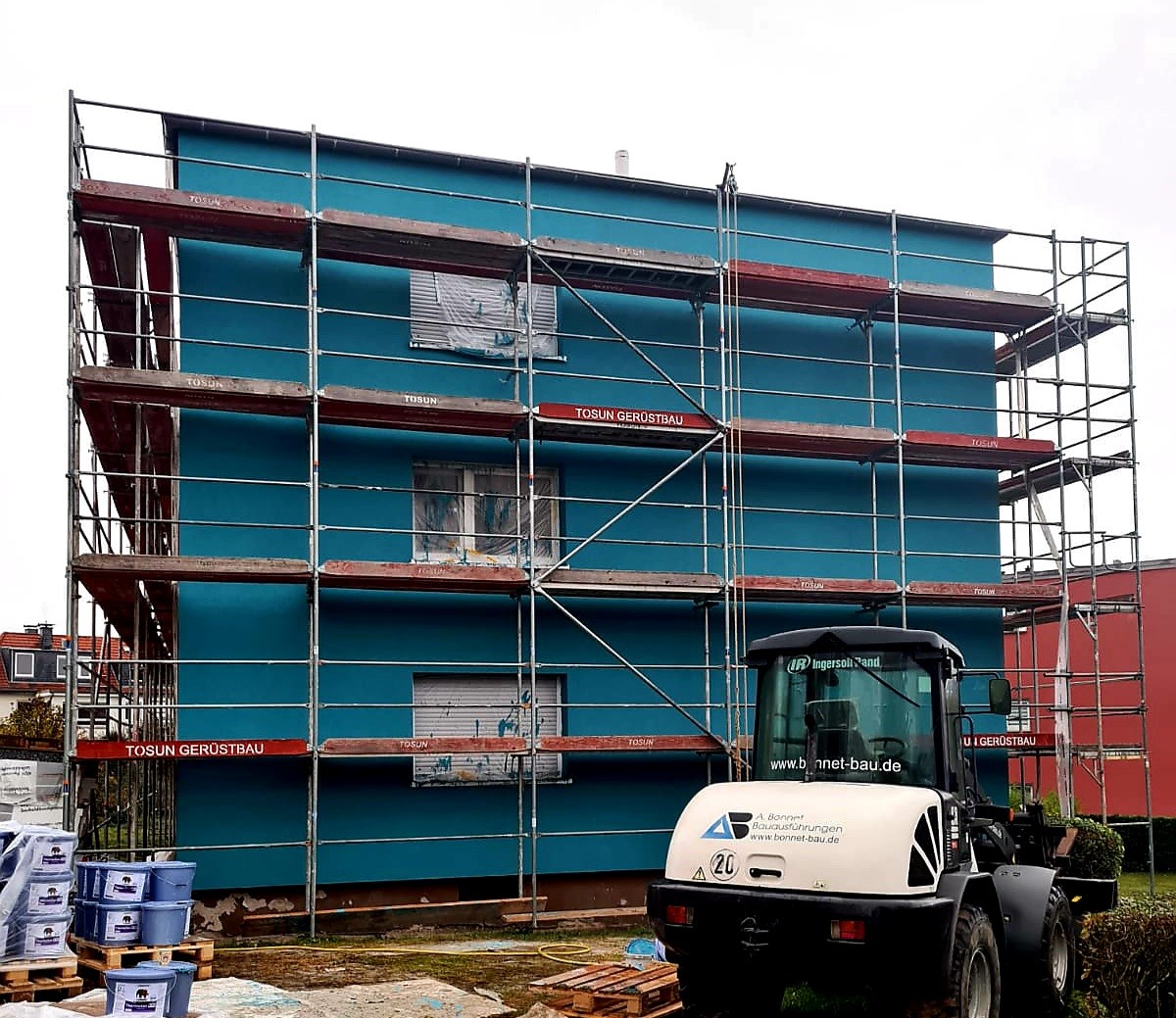 Ungefähr die Hälfte des Gebäudes muss hierzu für drei Monate in voller Höhe mit einem Gerüst versehen werden. Zunächst wurden die alten Fassadenplatten und die aus Holz bestehende Unterkonstruktion abgebrochen und fachgerecht entsorgt. Zur Erneuerung ist ein hochmodernes Wärmedämmverbundsystem zum Einsatz gekommen. Der neue Vollwärmeschutz besteht aus nicht brennbaren Mineralwolleplatten mit einer Dämmstärke von 160 mm. Mit dieser energetischen Modernisierung sämtlicher Fassadenflächen wird sich das Wohnklima innerhalb des Gebäudes noch weiter verbessern. Schon in der Wintersaison 2011/2012 ist aufgrund der neu gedämmten Fassadenteile eine spürbare Verringerung des Energieverbrauchs eingetreten.