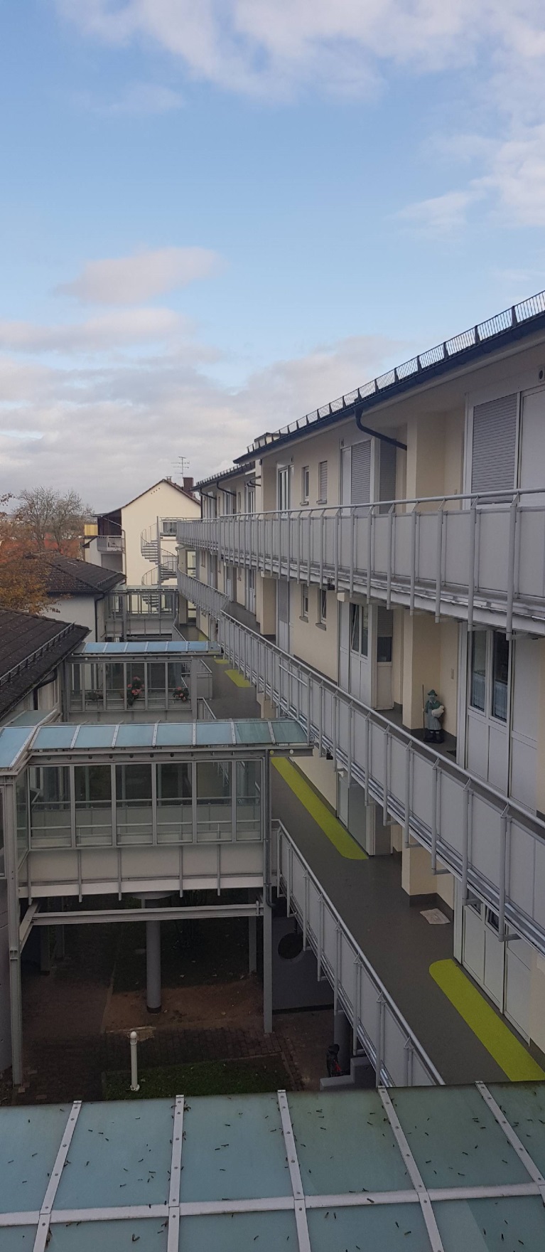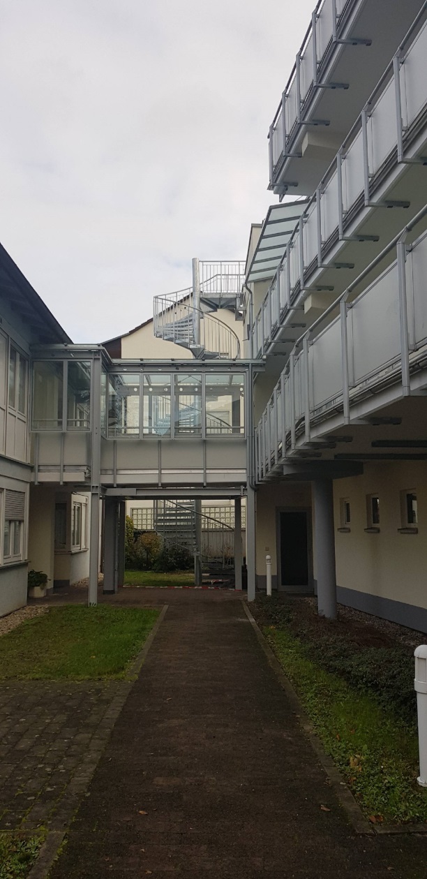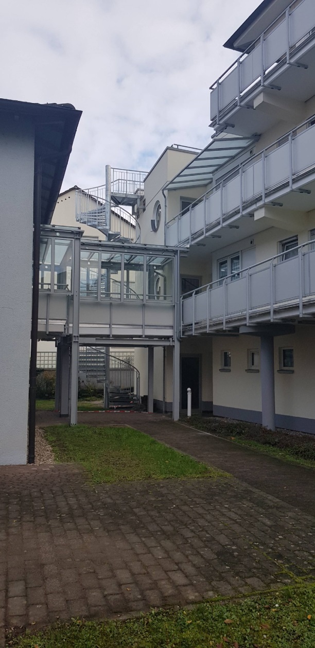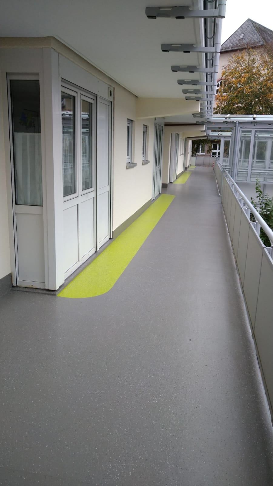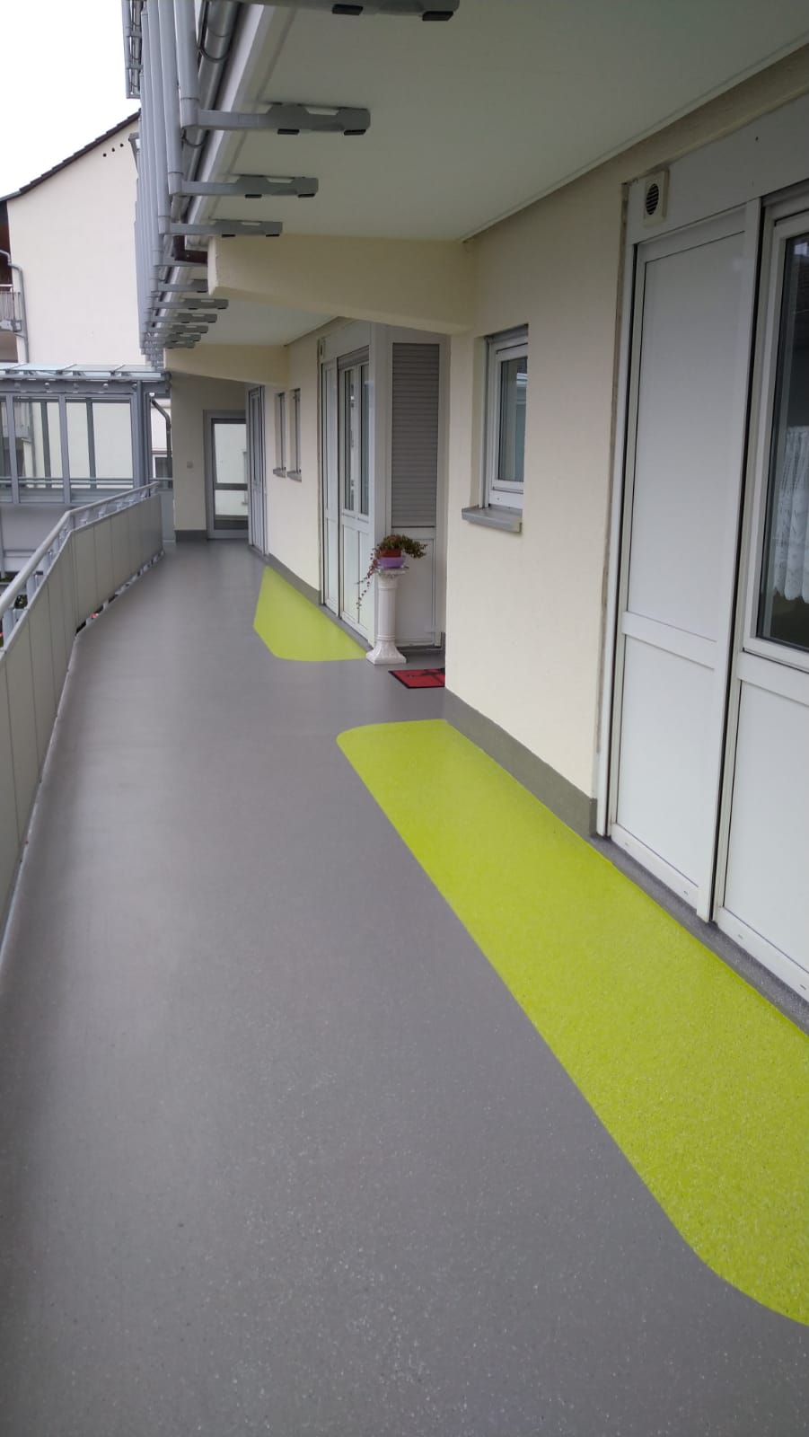 Um dieses Gefahrenpotential zu beseitigen wurde der Fliesenbelag entfernt, ein entsprechendes Gefälle geschaffen und eine rutschfeste Triflex-Beschichtung aufgetragen. Letzteres wurde extra für diese Art von Laubengängen ausgewählt, da die Gänge ständig wechselnden Witterungseinflüssen ausgesetzt sind.