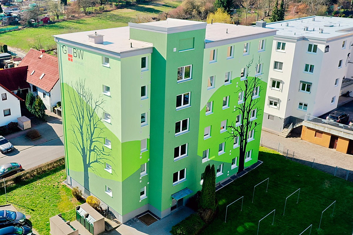 Ferner wurden die alten Aluminiumfenster durch moderne Kunststofffenster mit Isolierverglasung ersetzt. Da das Haus bereits über eine zeitgemäße Wärmedämmung verfügte, war nur noch ein neuer Farbanstrich notwendig. Da sich die Geschäftsstelle der GBW in dieser Liegenschaft befindet, sollte die Farbgestaltung die Geschichte der GBW und den genossenschaftlichen Wohngedanken widerspiegeln. In Zusammenarbeit mit einem lokalen Künstler entstand eine unverwechselbare Fassade mit Wiedererkennungswert.